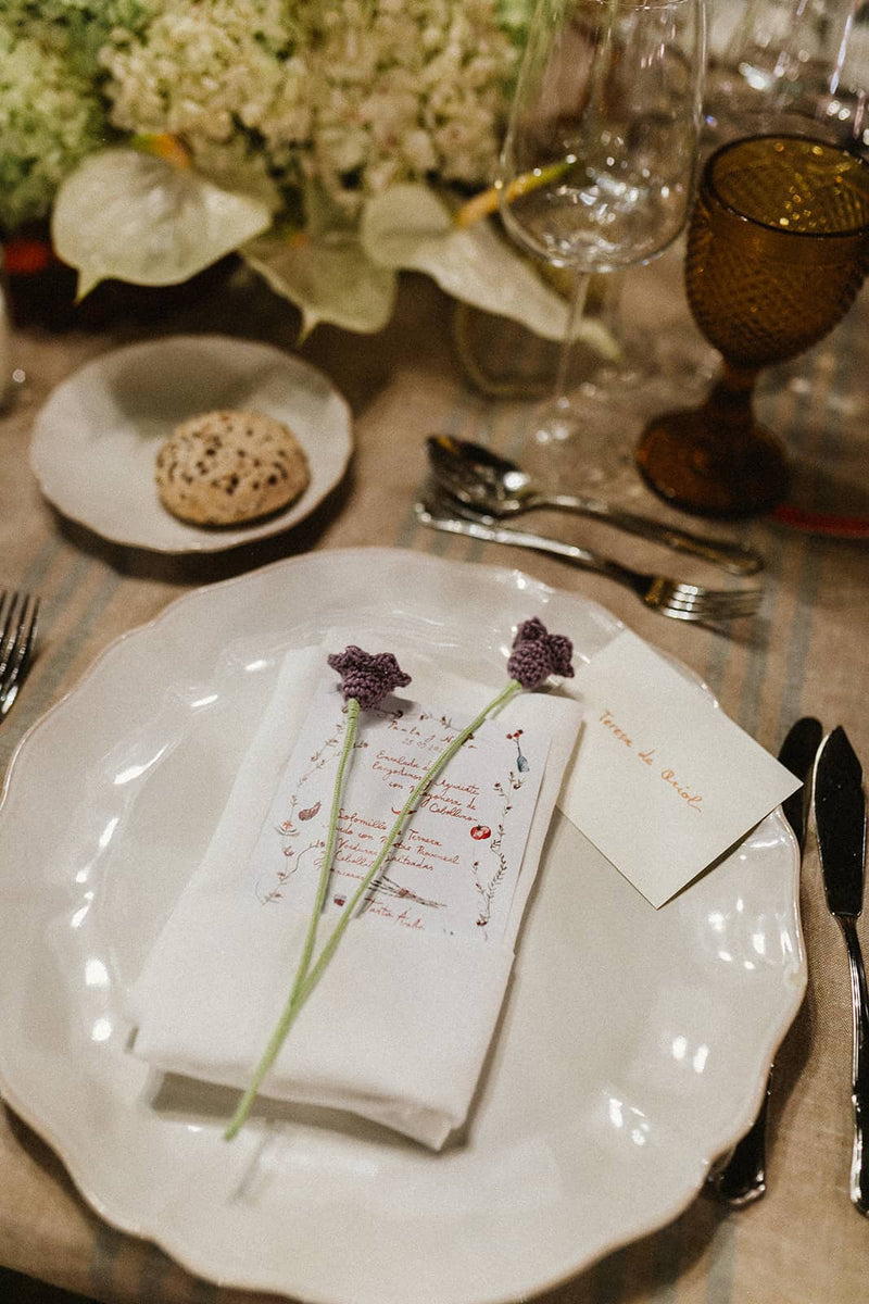 Flor de crochet de dimensión aproximada 25 cm, cosidas a mano. Incluye una nota de 9 x 14 cm con el nombre de la persona a la que se quiera regalar caligrafiado a mano.