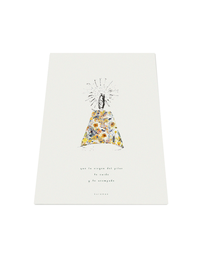 Lámina reproducción de ilustración Virgen del Pilar modelo 2021. Diseño de virgen y flores en acuarela.