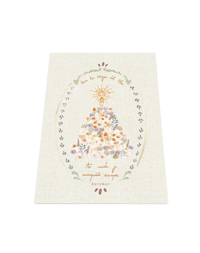 Lámina reproducción de ilustración Virgen del Pilar modelo 2023. Diseño de virgen y flores en acuarela.