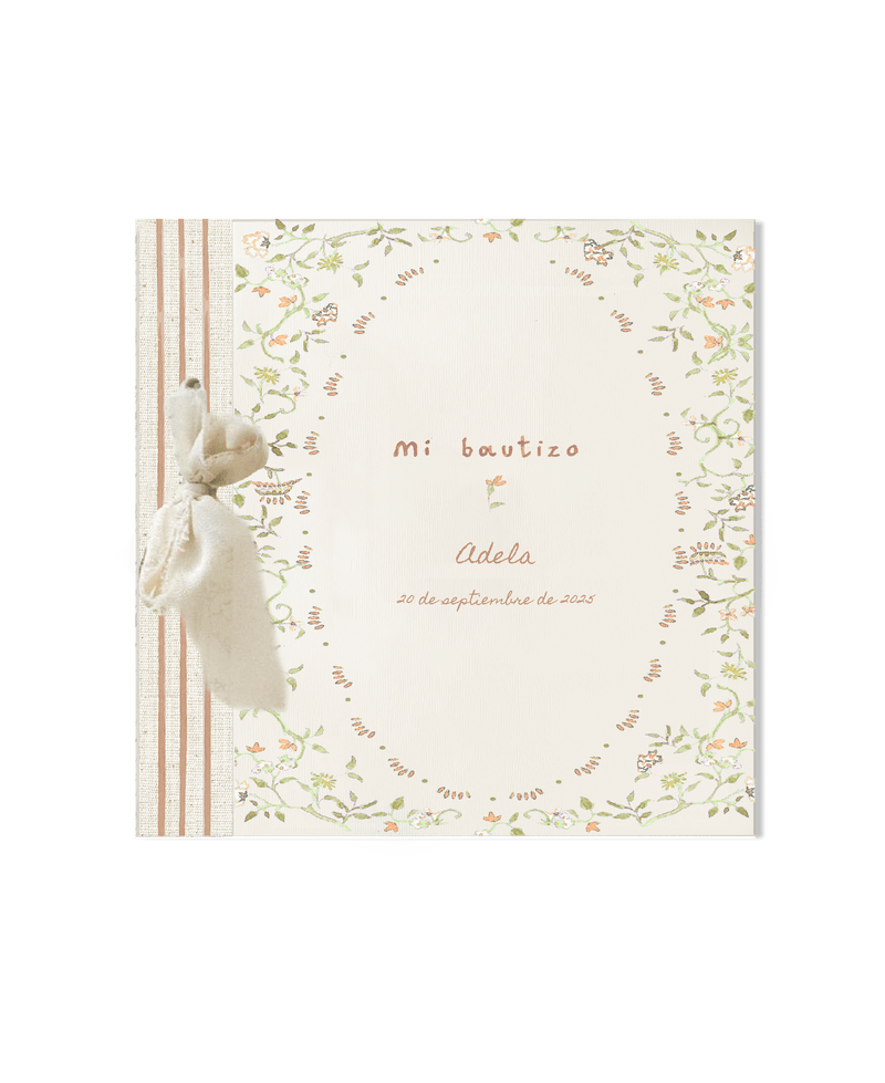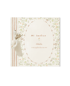 Nuestros libros de bautizo tienen unas medidas de 22,5 x 22,5 cm y están compuestos por un máximo de 21 páginas de papel de 300 gramos (incluida la portada) hendidas, perforadas y encuadernadas con un lazo.