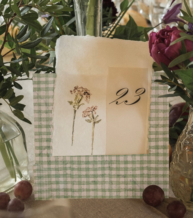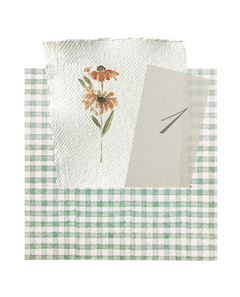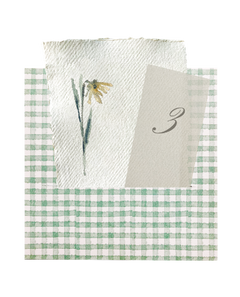 - Papel artesano tamaño A6 con flor en acuarela (una flor distinta por cada mesa)