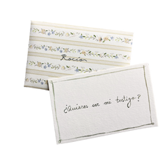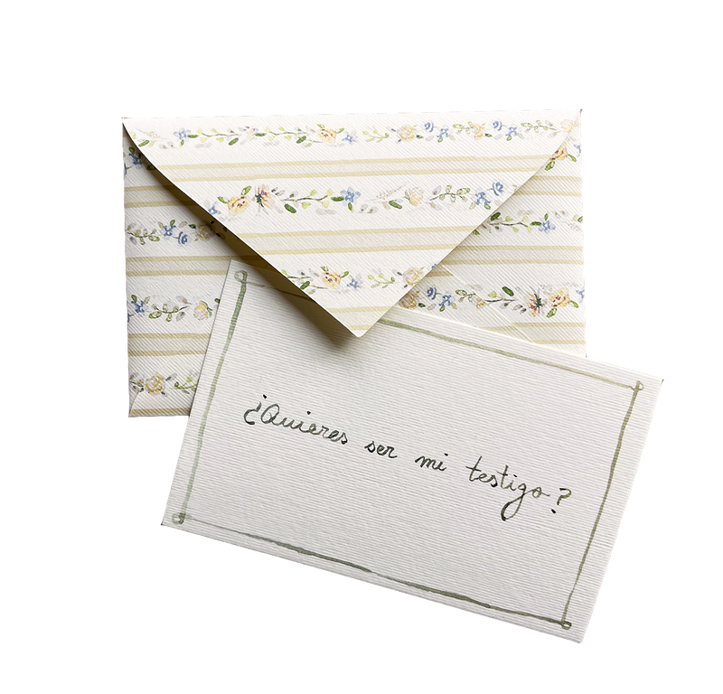 Este sobre incluye una tarjeta en su interior con la frase '¿Quieres ser mi testigo?' caligrafiada en acuarela.
