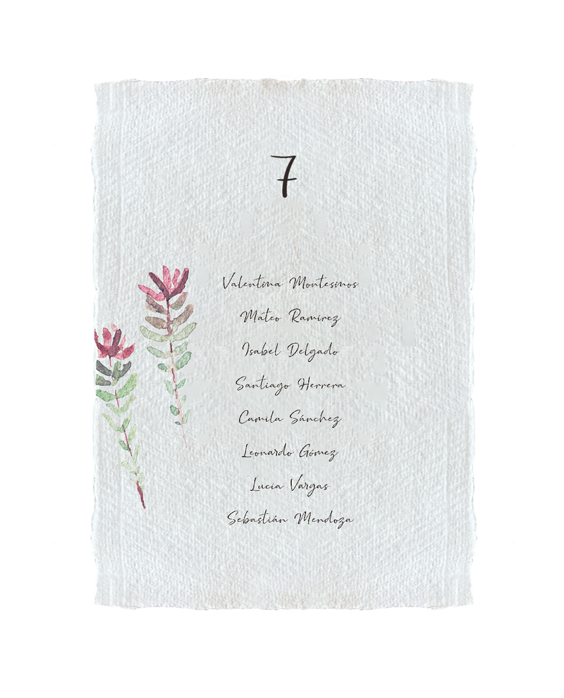 Seating Plan en papel artesano 21 x 15 cm con una flor distinta por cada una de las mesas.